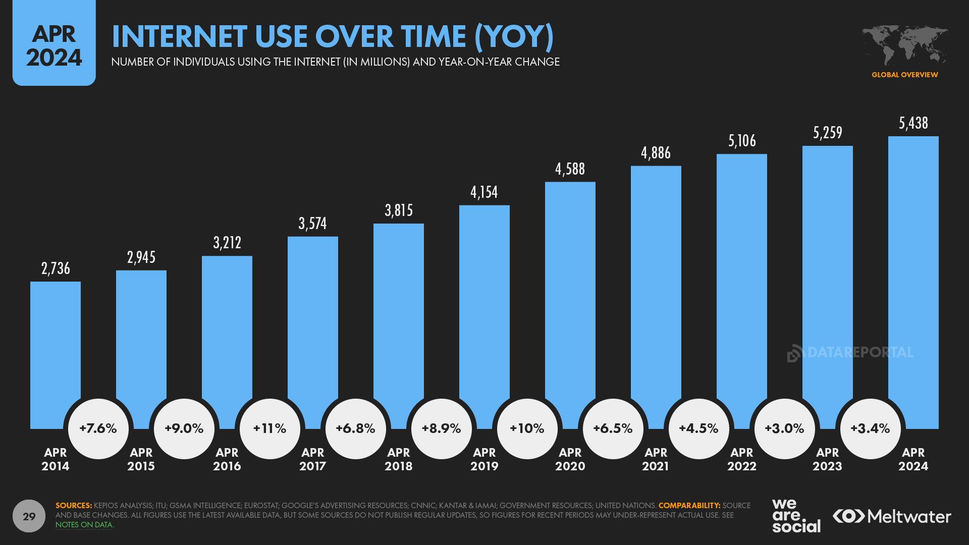 - The world’s connected population grew by 178 million users in the 12 months to April 2024.