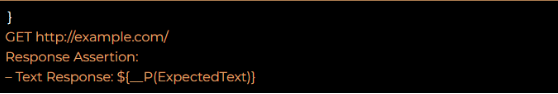 In the above example (Bash), JMeter sends an HTTP GET request to the URL “http://example.com/”. The “Response Assertion” component is then used to check if the response from the server contains a specific text string, specified by the “__P(ExpectedText)” function.
