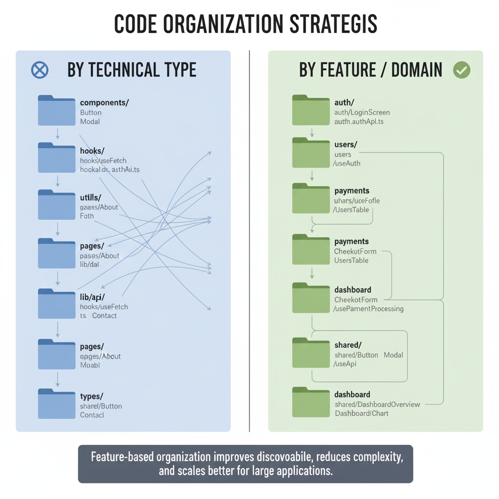 - Works for both frameworks: React developers get clean client-side organization and Next.js developers leverage route groups + layouts + RSC.